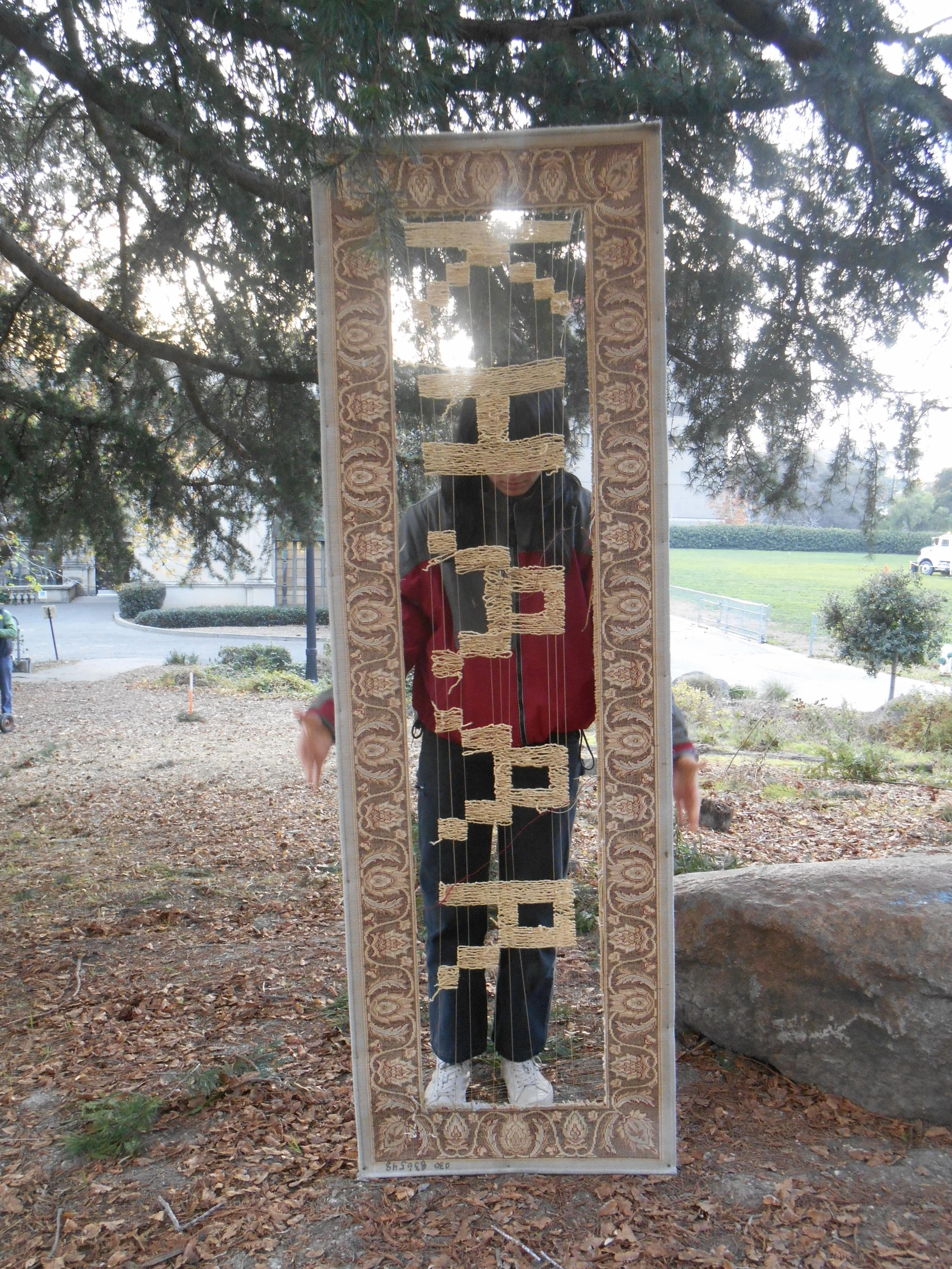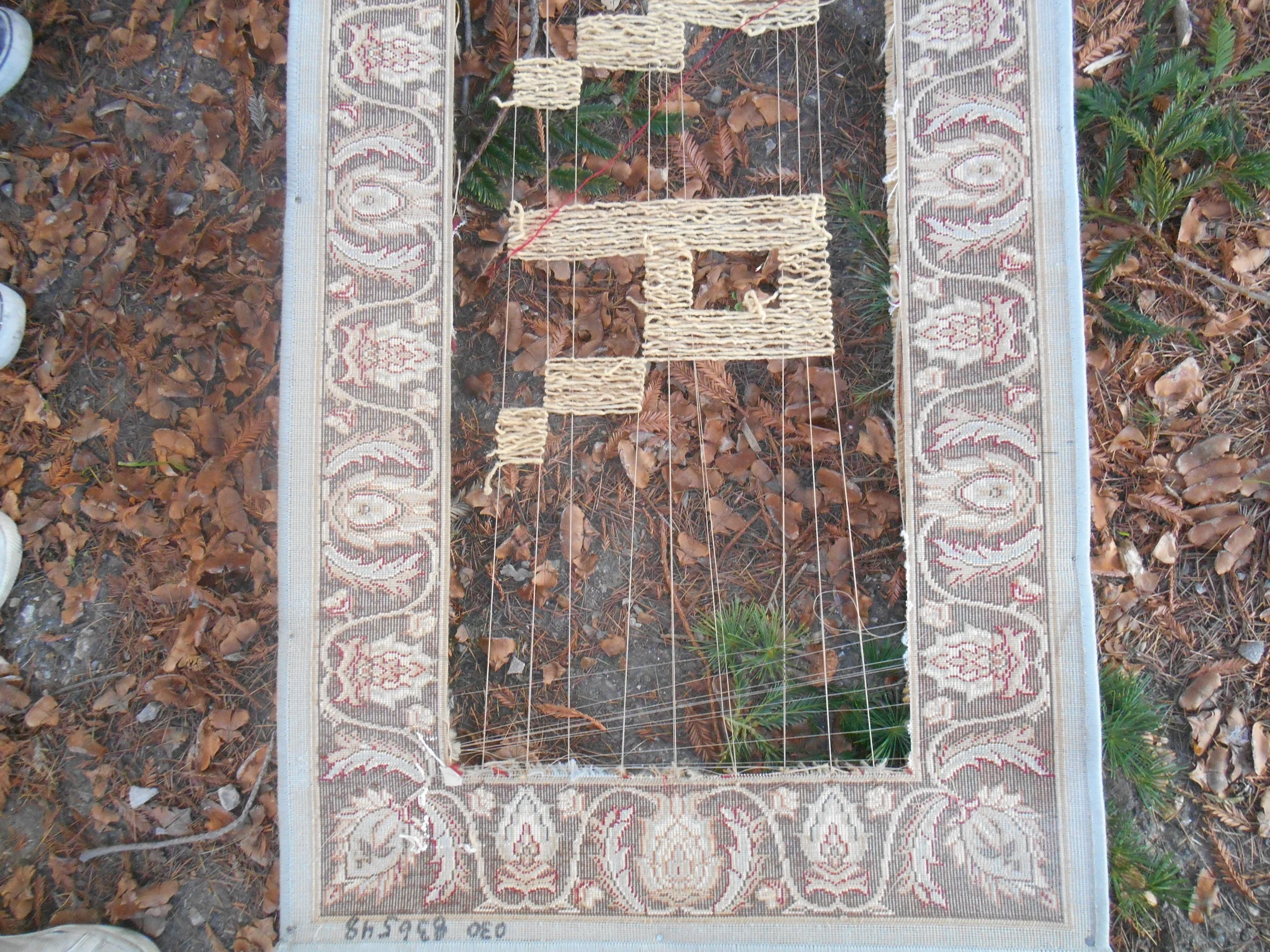 Found rug, wood, fibers hand-dyed with pomegranate skin.